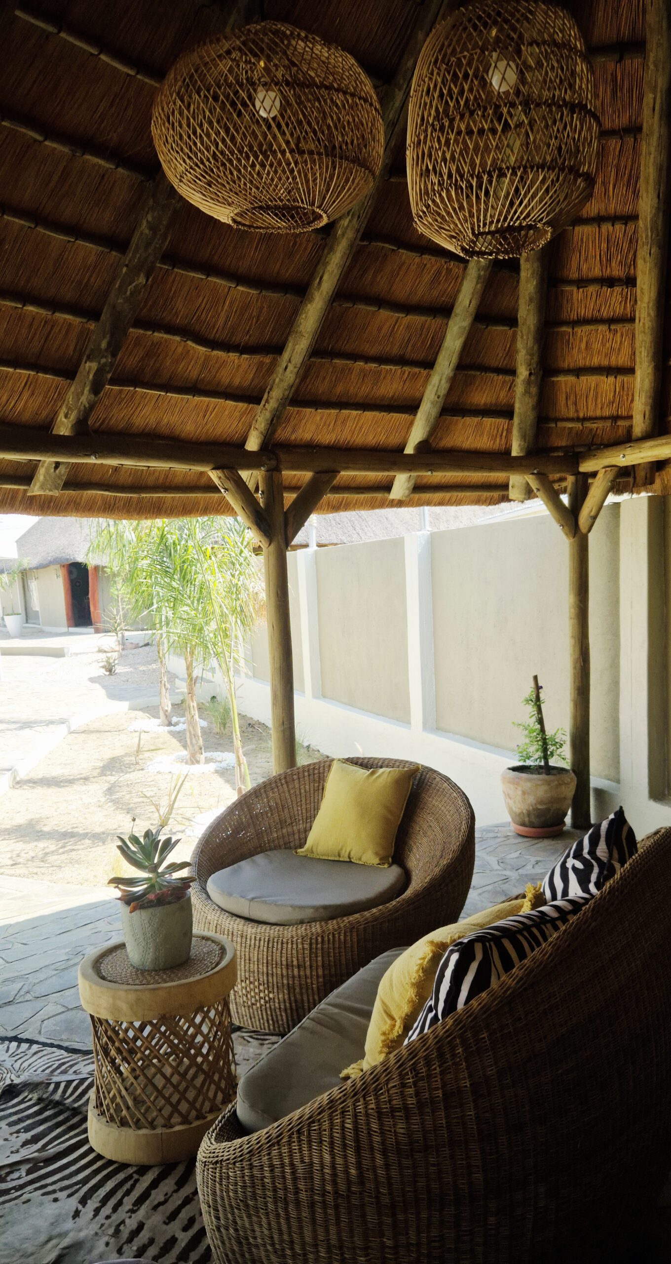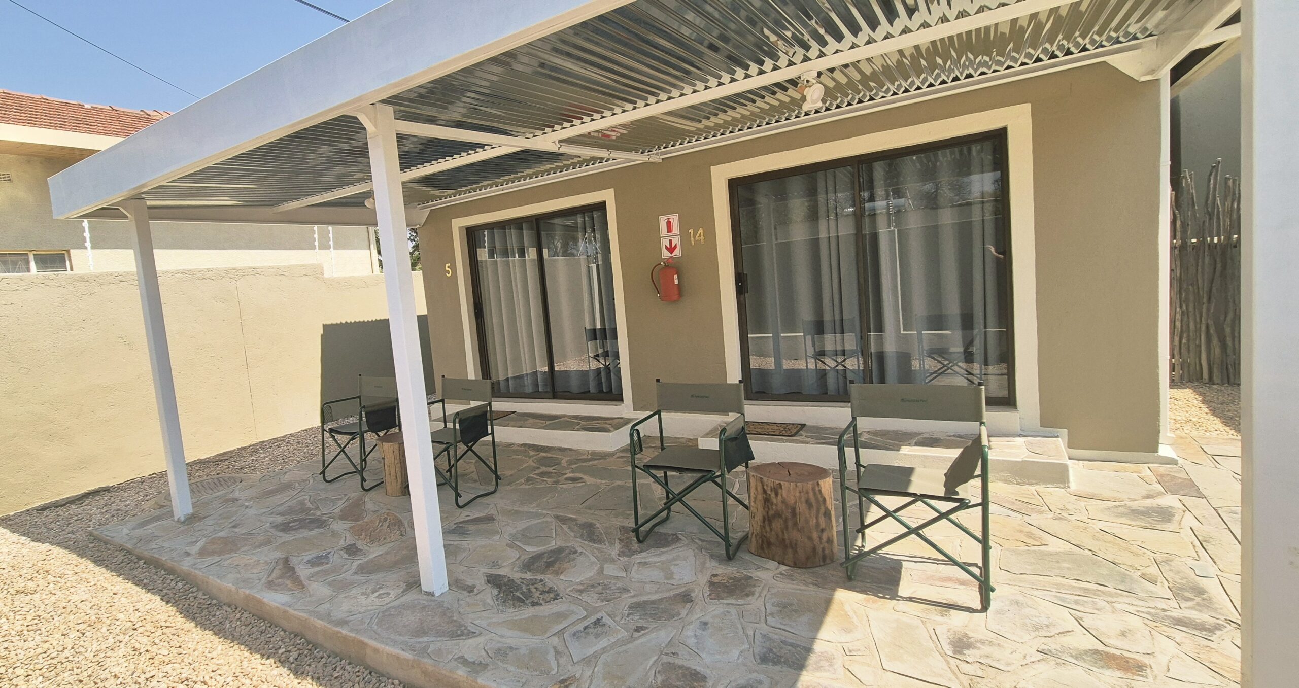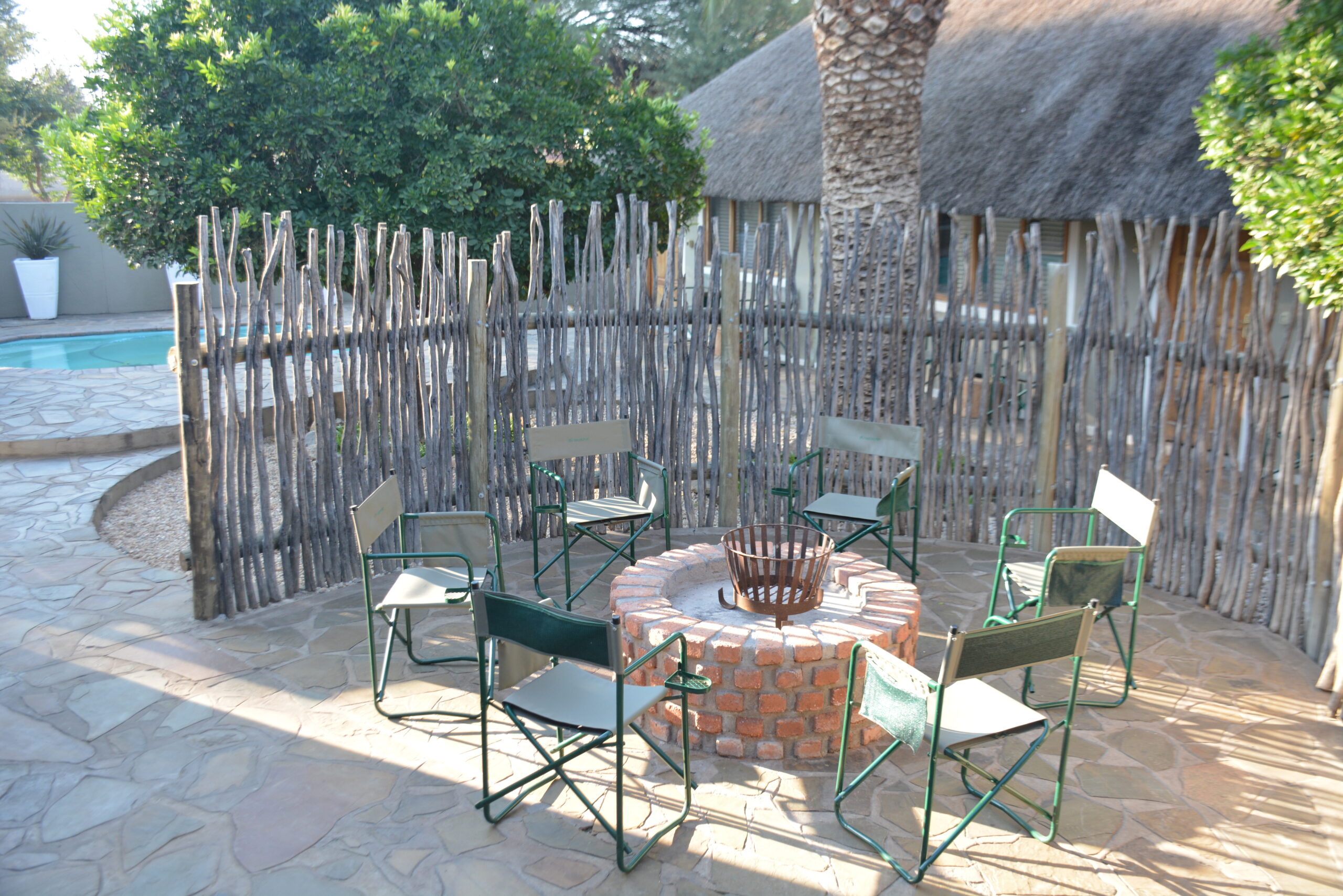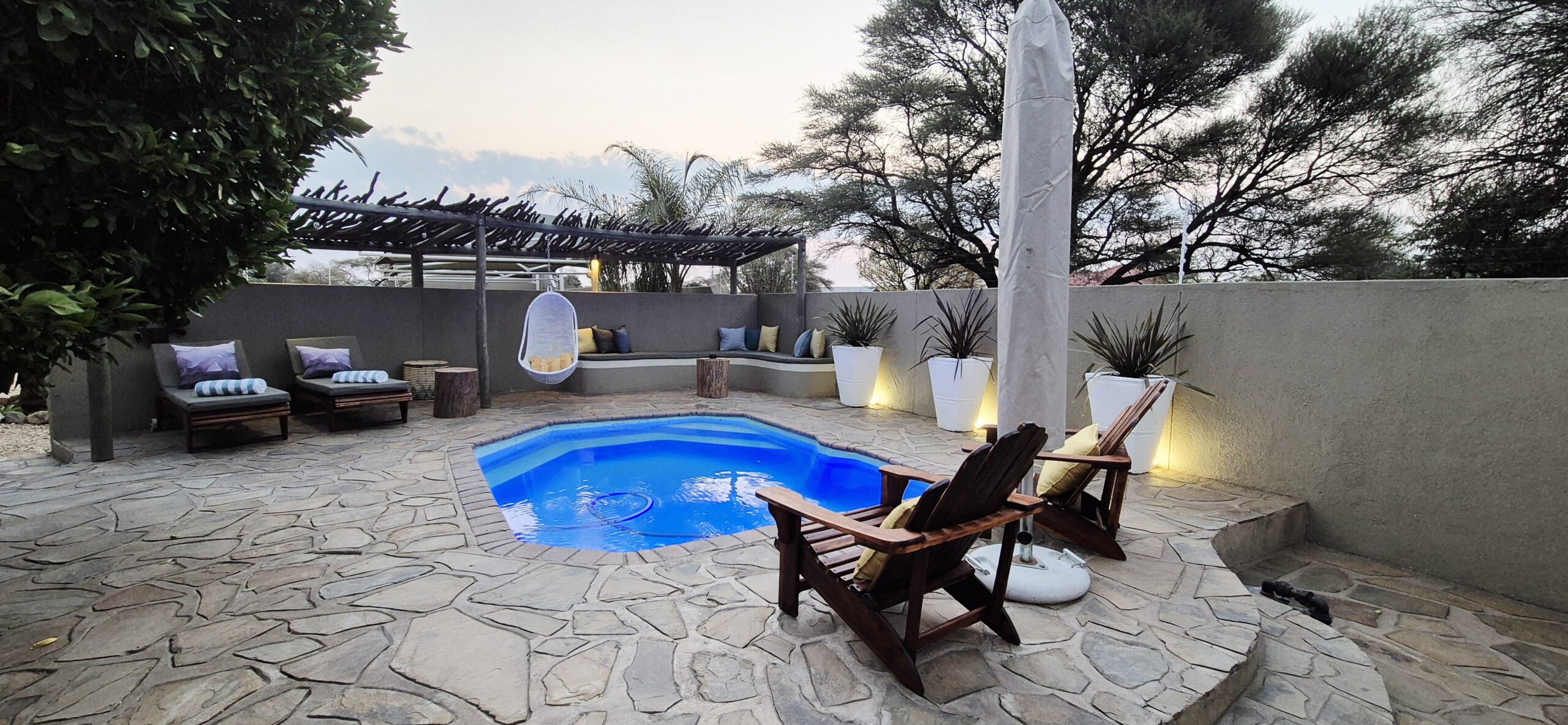 At Khaya Guesthouse, comfort and relaxation are at the heart of your stay. Each room features a shaded patio with two chairs and a small table, perfect for quiet moments outdoors. Guests can also enjoy our inviting thatch lapa with a lounge suite, ideal for socializing or unwinding in the shade. Evenings come alive around the firepit boma area, where stories and starlight meet. For those seeking sun and serenity, the poolside lounge area offers comfortable chairs and sun loungers, creating the perfect setting to relax, refresh, and soak in the Namibian atmosphere.