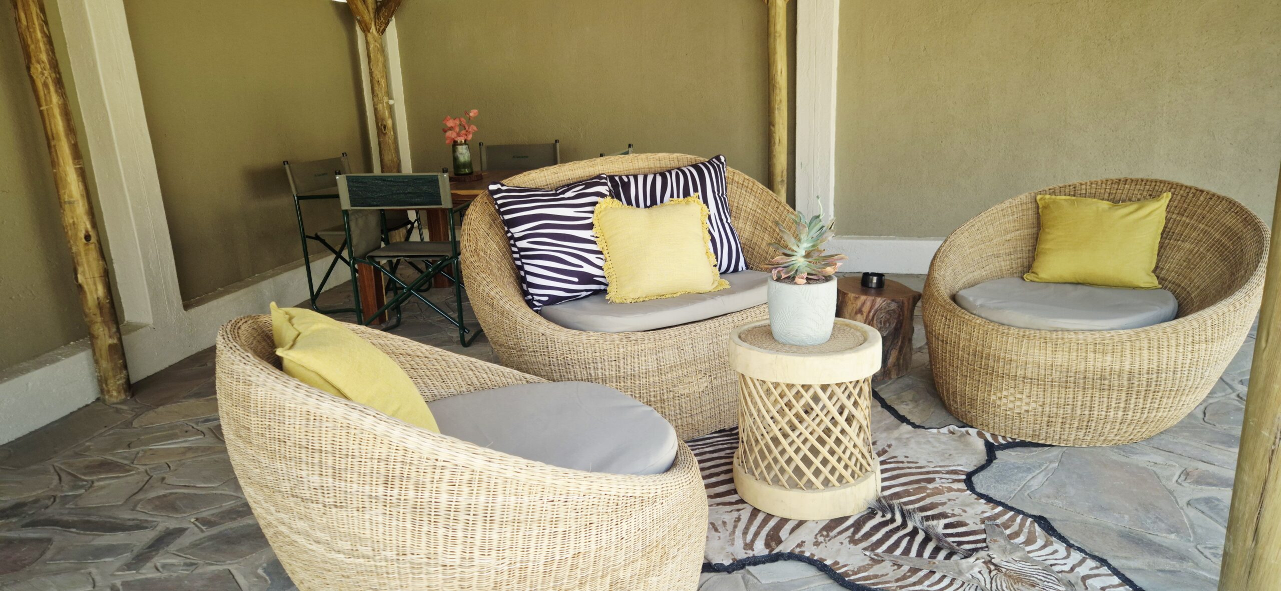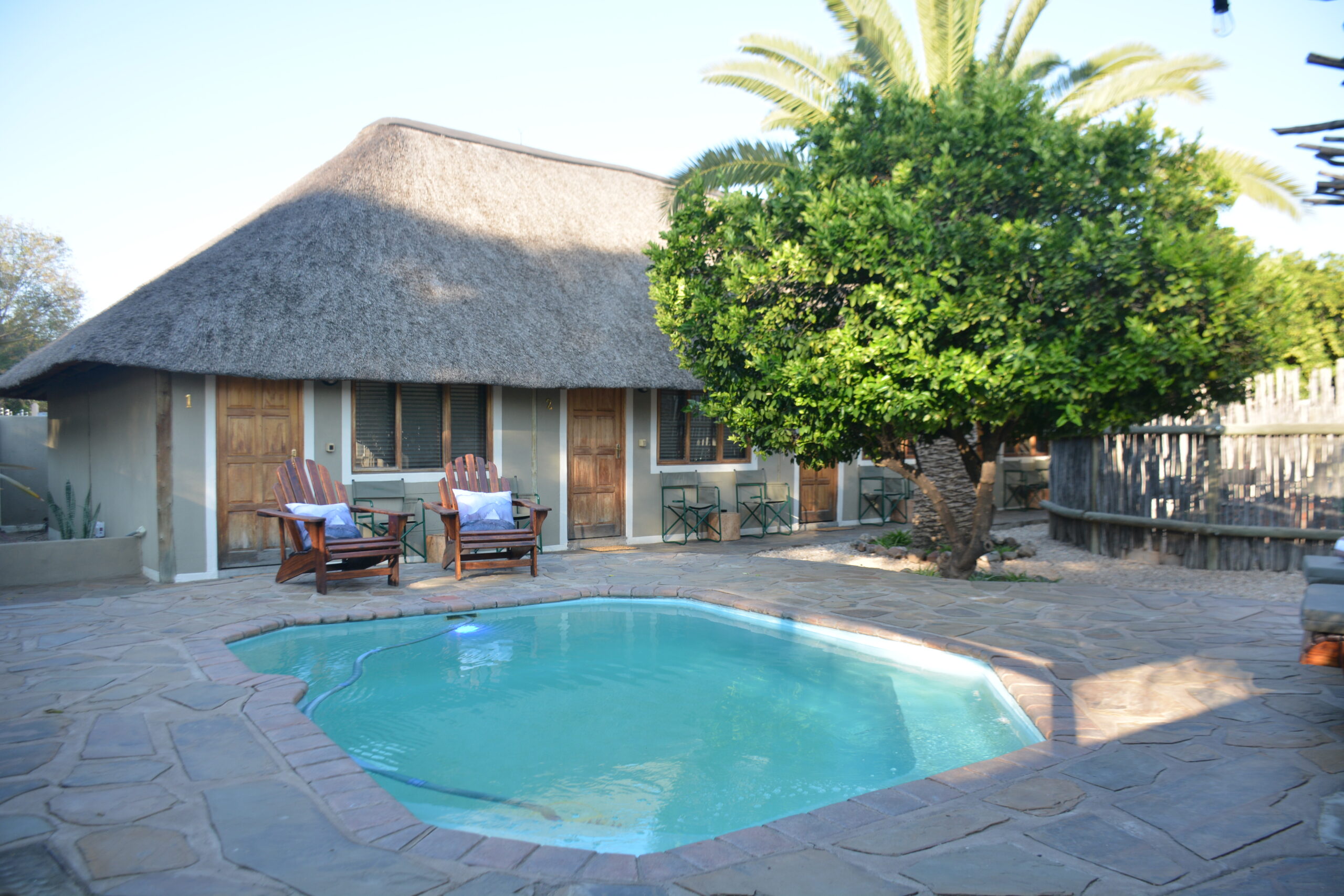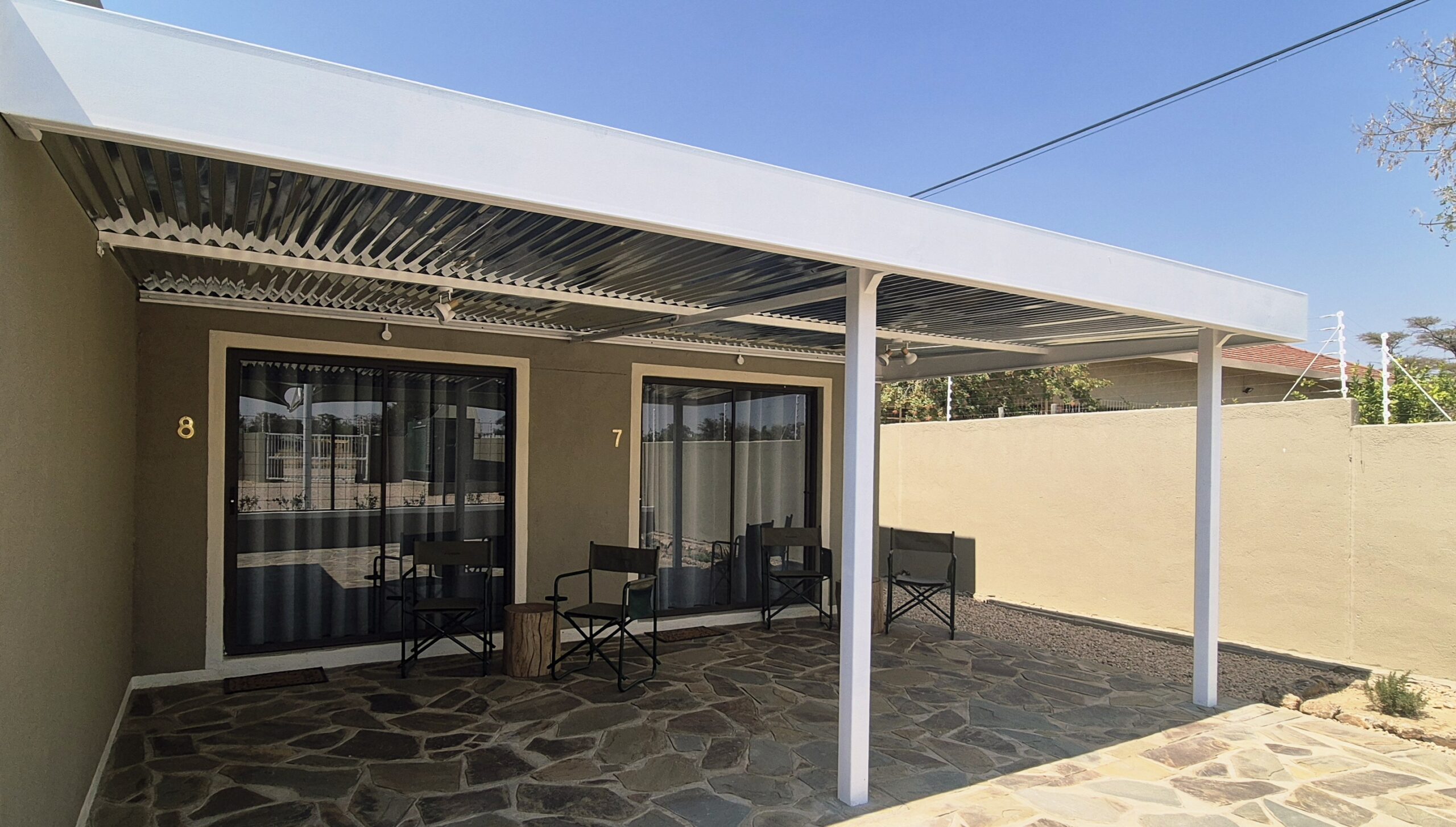 At Khaya Guesthouse, comfort and relaxation are at the heart of your stay. Each room features a shaded patio with two chairs and a small table, perfect for quiet moments outdoors. Guests can also enjoy our inviting thatch lapa with a lounge suite, ideal for socializing or unwinding in the shade. Evenings come alive around the firepit boma area, where stories and starlight meet. For those seeking sun and serenity, the poolside lounge area offers comfortable chairs and sun loungers, creating the perfect setting to relax, refresh, and soak in the Namibian atmosphere.
