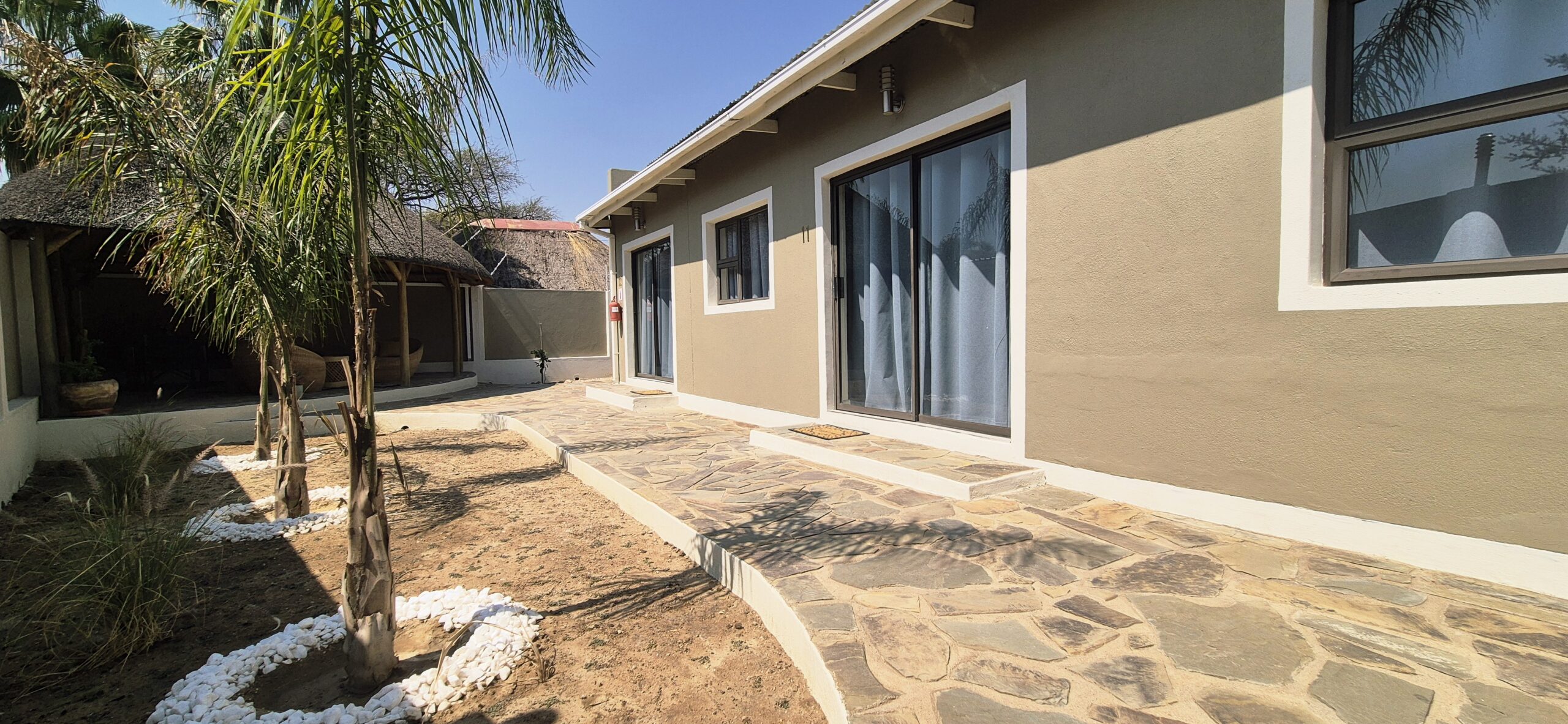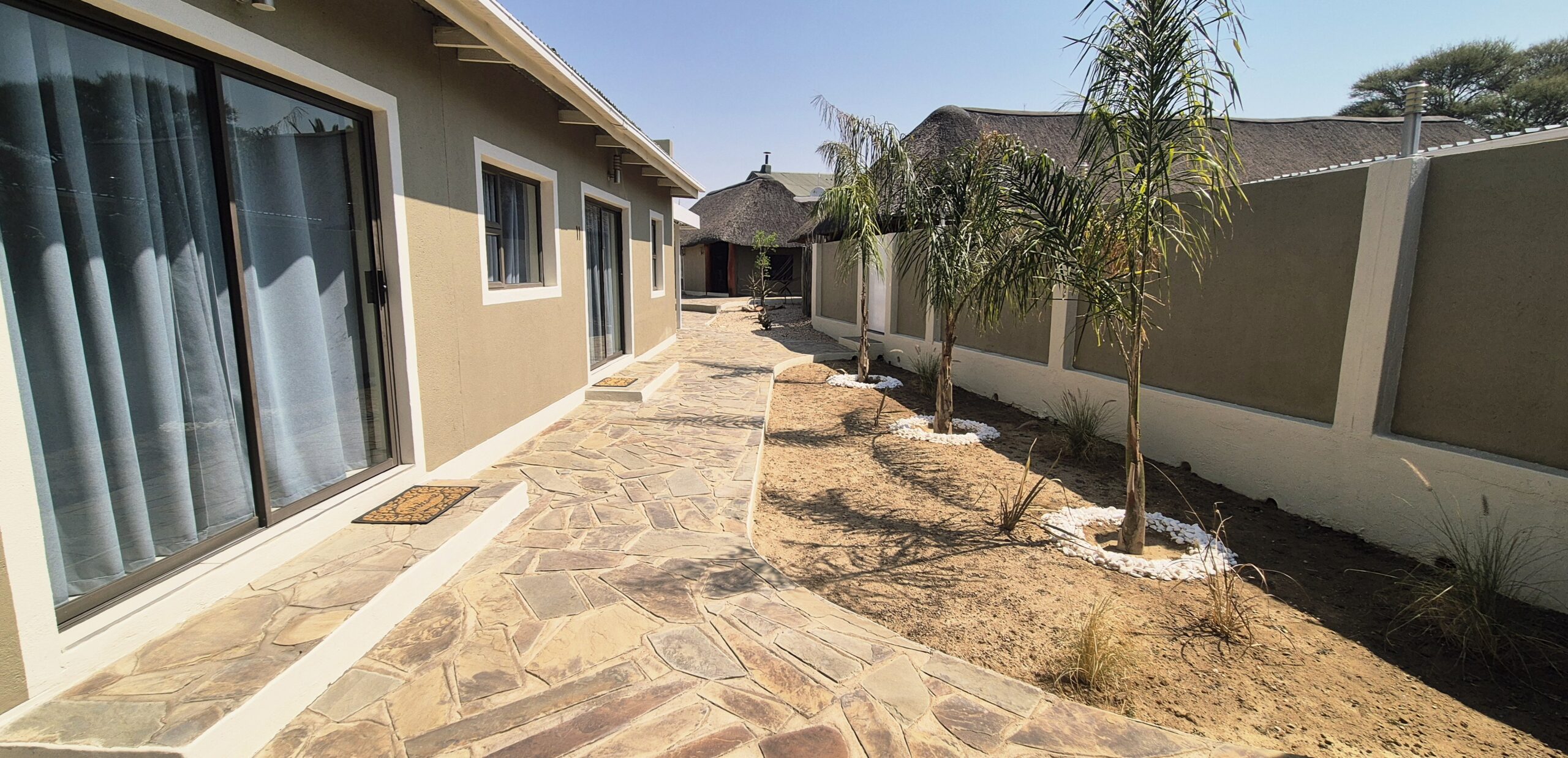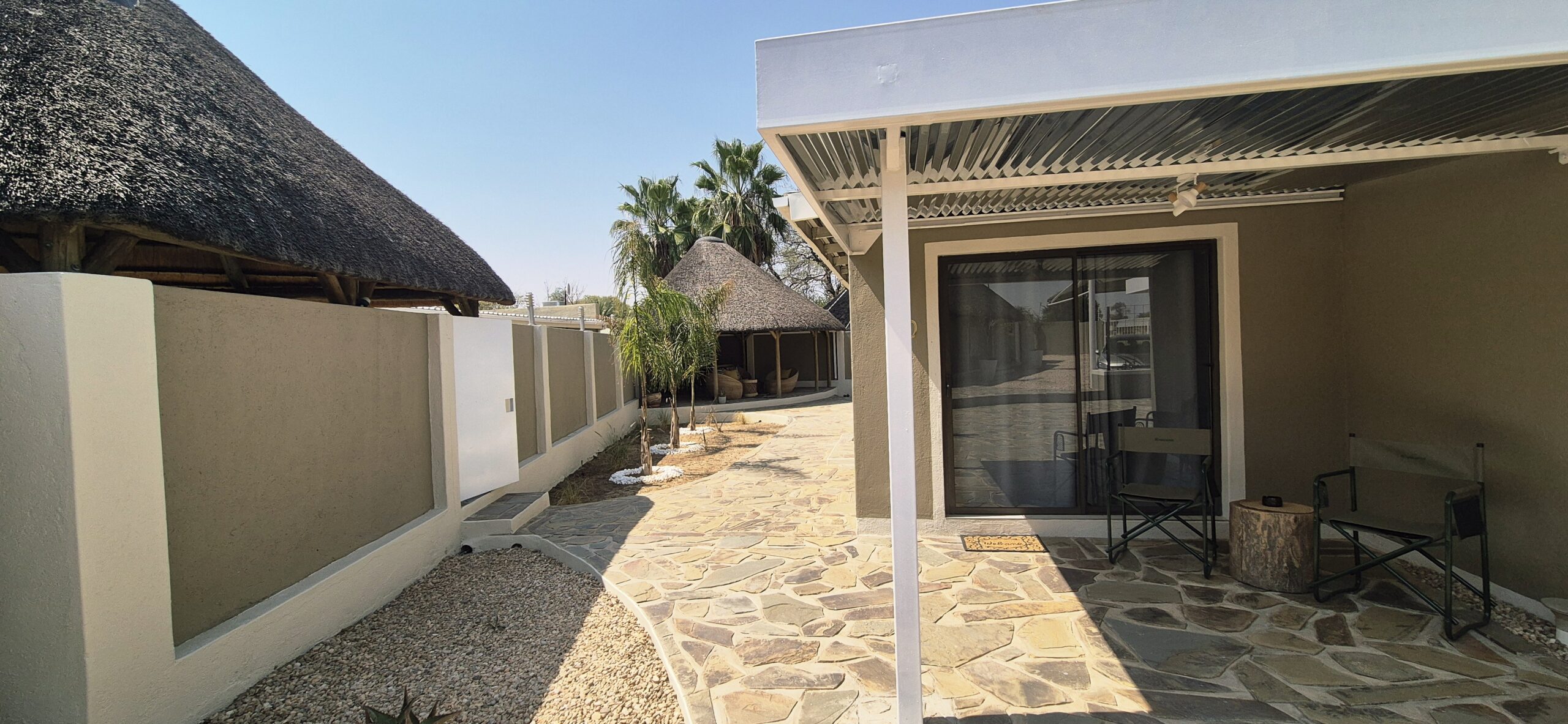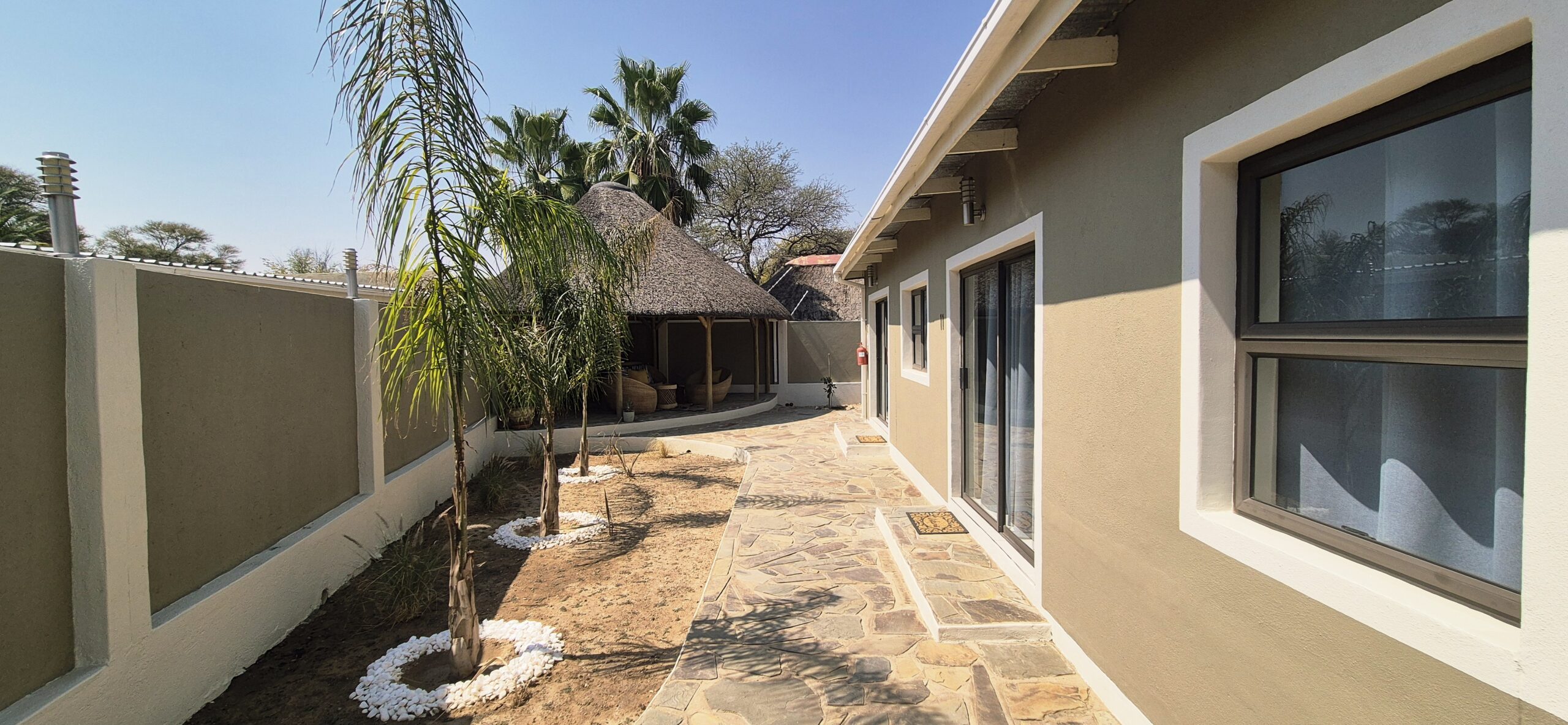 At Khaya Guesthouse, comfort and relaxation are at the heart of your stay. Each room features a shaded patio with two chairs and a small table, perfect for quiet moments outdoors. Guests can also enjoy our inviting thatch lapa with a lounge suite, ideal for socializing or unwinding in the shade. Evenings come alive around the firepit boma area, where stories and starlight meet. For those seeking sun and serenity, the poolside lounge area offers comfortable chairs and sun loungers, creating the perfect setting to relax, refresh, and soak in the Namibian atmosphere.